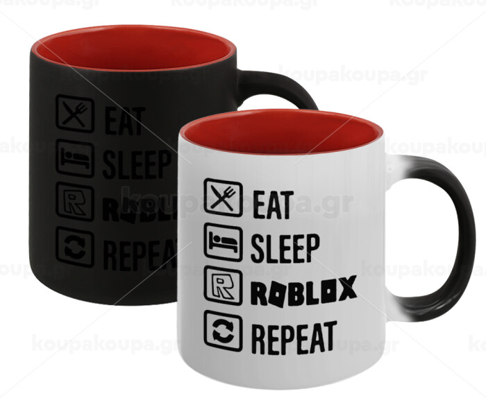 Eat, Sleep, Roblox, Repeat, Κούπα Μαγική εσωτερικό κόκκινο, κεραμική, 330ml που αλλάζει χρώμα με το ζεστό ρόφημα