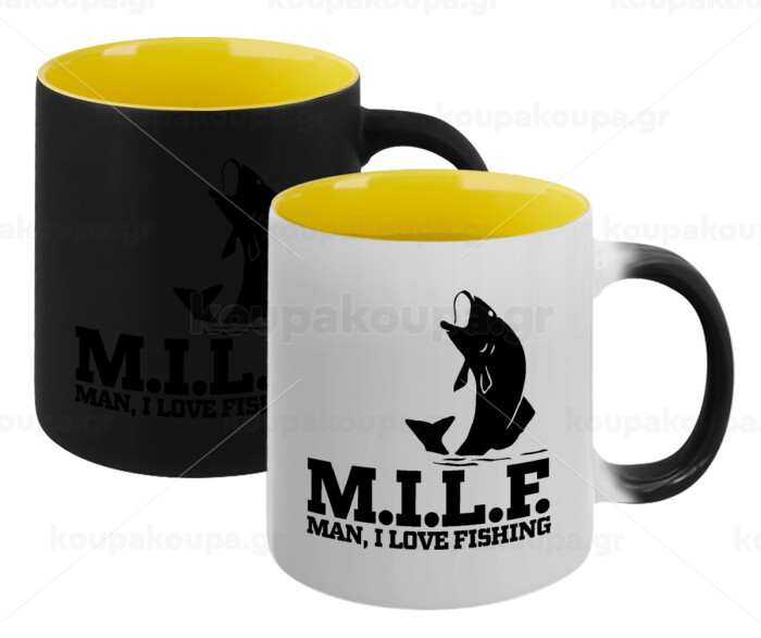 M.I.L.F. Mam i love fishing, Κούπα Μαγική εσωτερικό κίτρινη, κεραμική 330ml που αλλάζει χρώμα με το ζεστό ρόφημα