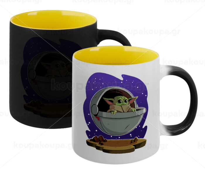 Baby Yoda mandalorian, Κούπα Μαγική εσωτερικό κίτρινη, κεραμική 330ml που αλλάζει χρώμα με το ζεστό ρόφημα