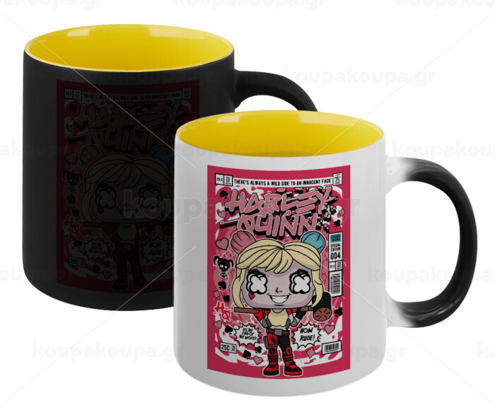 Harley Quinn (Χάρλεϊ Κουίν), Κούπα Μαγική εσωτερικό κίτρινη, κεραμική 330ml που αλλάζει χρώμα με το ζεστό ρόφημα