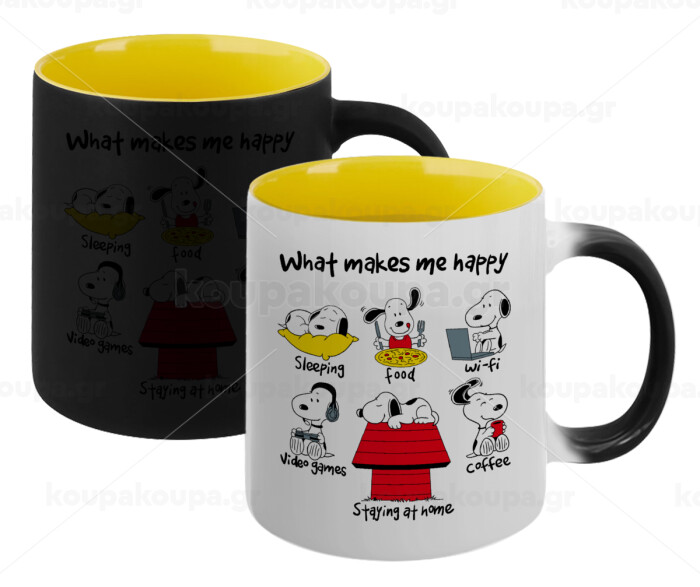 Snoopy what makes my happy, Κούπα Μαγική εσωτερικό κίτρινη, κεραμική 330ml που αλλάζει χρώμα με το ζεστό ρόφημα
