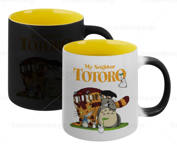 Totoro and Cat, Κούπα Μαγική εσωτερικό κίτρινη, κεραμική 330ml που αλλάζει χρώμα με το ζεστό ρόφημα