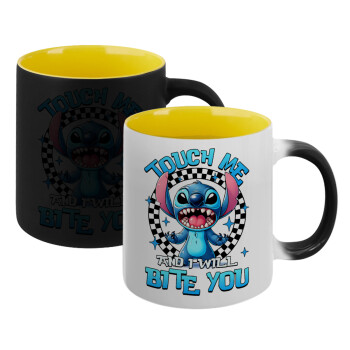 Stitch Touch Me And I Will Bite You, Κούπα Μαγική εσωτερικό κίτρινη, κεραμική 330ml που αλλάζει χρώμα με το ζεστό ρόφημα