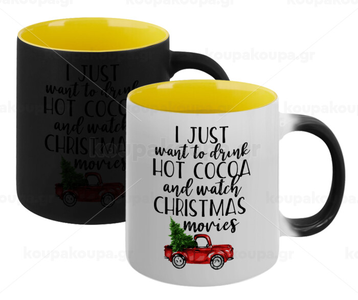 I just want to drink hot cocoa and watch christmas movies pickup car, Κούπα Μαγική εσωτερικό κίτρινη, κεραμική 330ml που αλλάζει χρώμα με το ζεστό ρόφημα