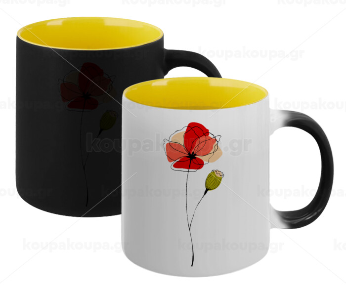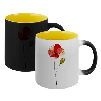 Red poppy flowers papaver, Κούπα Μαγική εσωτερικό κίτρινη, κεραμική 330ml που αλλάζει χρώμα με το ζεστό ρόφημα