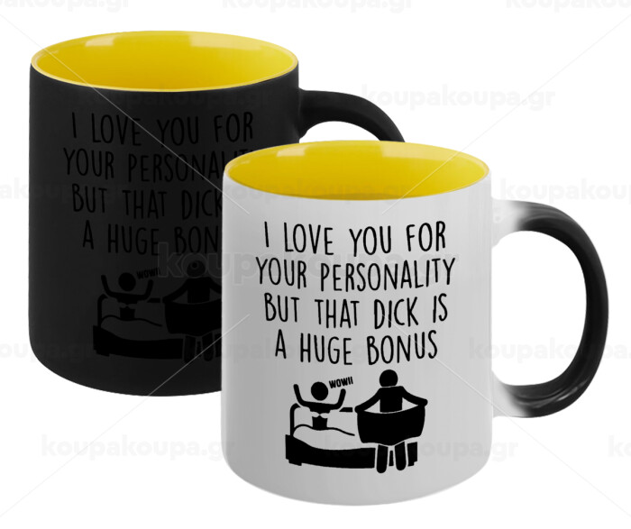 I Love You for Your Personality But that D... Is a Huge Bonus , Κούπα Μαγική εσωτερικό κίτρινη, κεραμική 330ml που αλλάζει χρώμα με το ζεστό ρόφημα