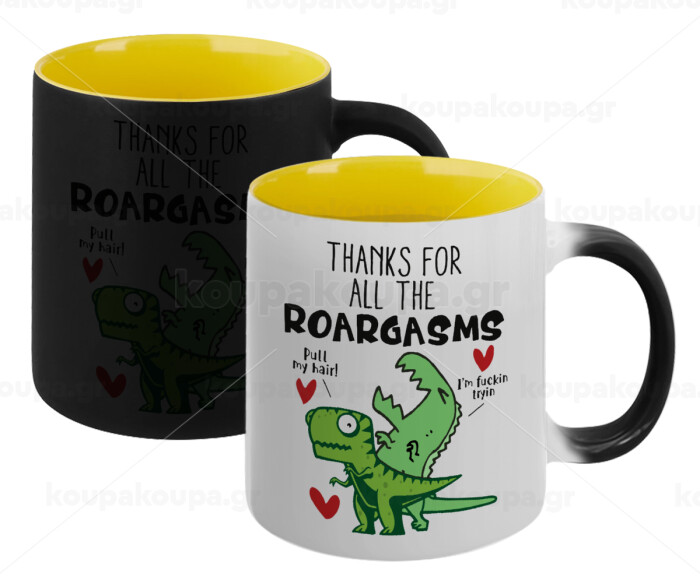 Thanks for all the ROARGASMS, Κούπα Μαγική εσωτερικό κίτρινη, κεραμική 330ml που αλλάζει χρώμα με το ζεστό ρόφημα