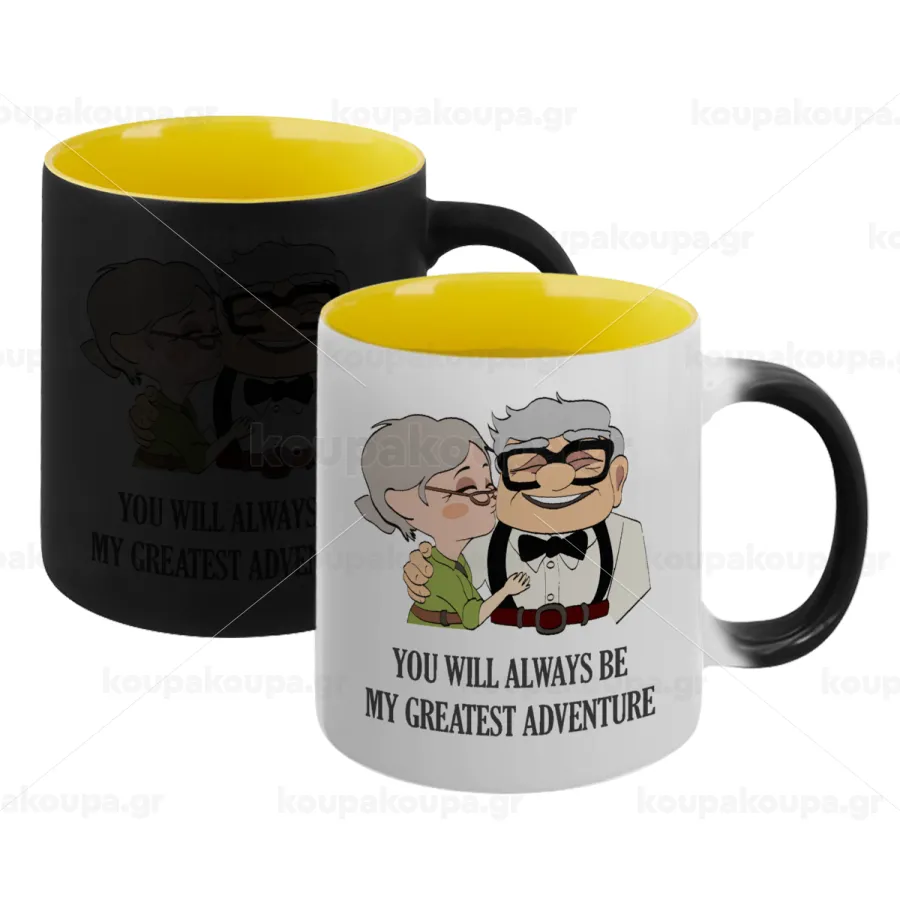 UP, YOU WILL ALWAYS BE MY GREATEST ADVENTURE, Κούπα Μαγική εσωτερικό κίτρινη, κεραμική 330ml που αλλάζει χρώμα με το ζεστό ρόφημα