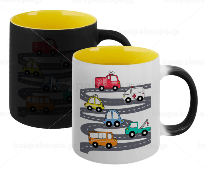 Hand drawn childish set with cars, Κούπα Μαγική εσωτερικό κίτρινη, κεραμική 330ml που αλλάζει χρώμα με το ζεστό ρόφημα