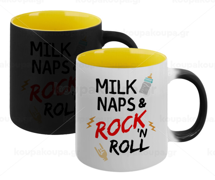 milk naps and Rock n' Roll, Κούπα Μαγική εσωτερικό κίτρινη, κεραμική 330ml που αλλάζει χρώμα με το ζεστό ρόφημα