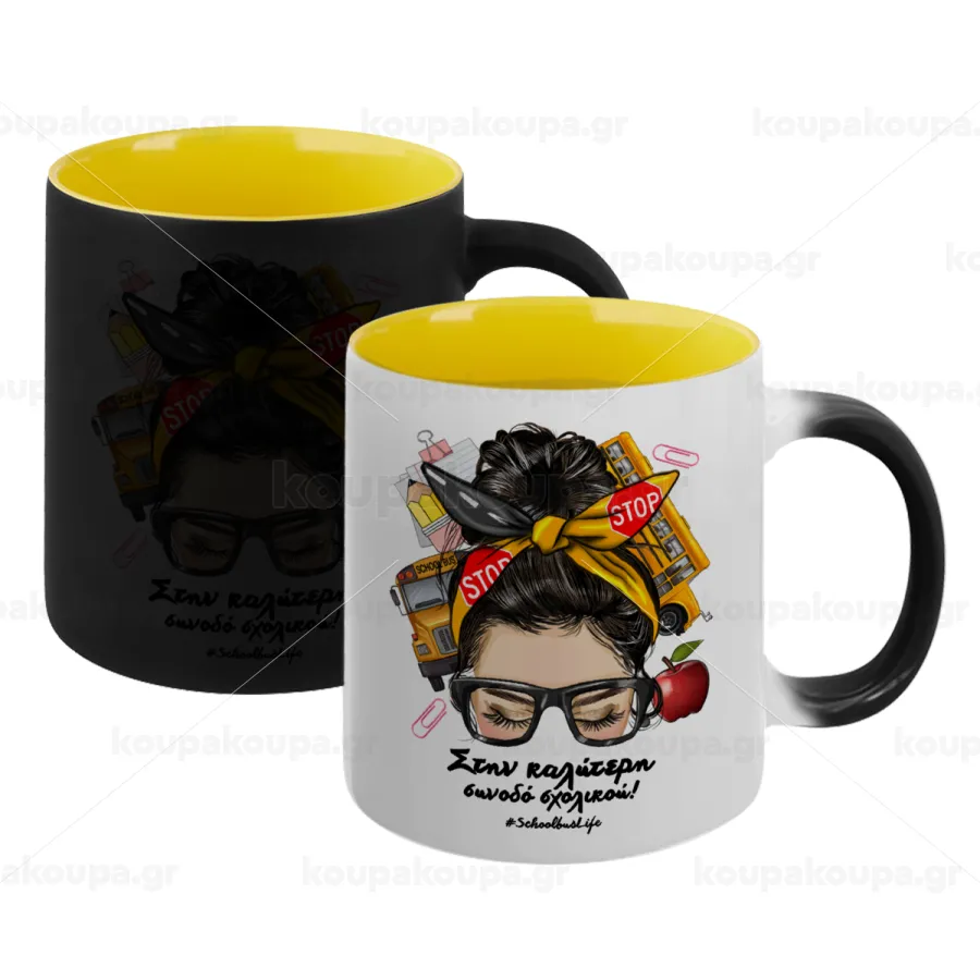 Στην καλύτερη συνοδό σχολικού!, Κούπα Μαγική εσωτερικό κίτρινη, κεραμική 330ml που αλλάζει χρώμα με το ζεστό ρόφημα