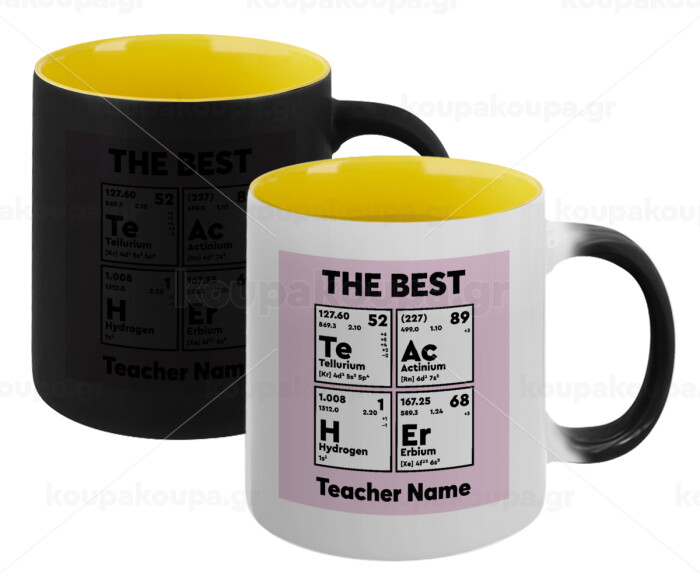 THE BEST Teacher chemical symbols, Κούπα Μαγική εσωτερικό κίτρινη, κεραμική 330ml που αλλάζει χρώμα με το ζεστό ρόφημα