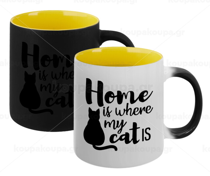 Home is where my cat is!, Κούπα Μαγική εσωτερικό κίτρινη, κεραμική 330ml που αλλάζει χρώμα με το ζεστό ρόφημα