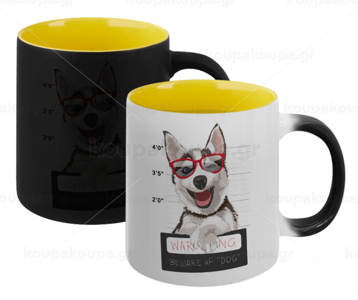 Warning, beware of Dog, Κούπα Μαγική εσωτερικό κίτρινη, κεραμική 330ml που αλλάζει χρώμα με το ζεστό ρόφημα