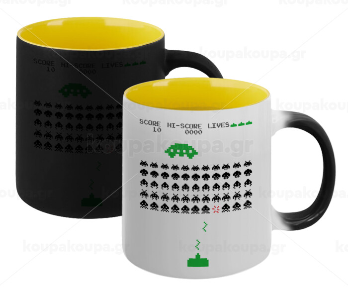 Space invaders, Κούπα Μαγική εσωτερικό κίτρινη, κεραμική 330ml που αλλάζει χρώμα με το ζεστό ρόφημα