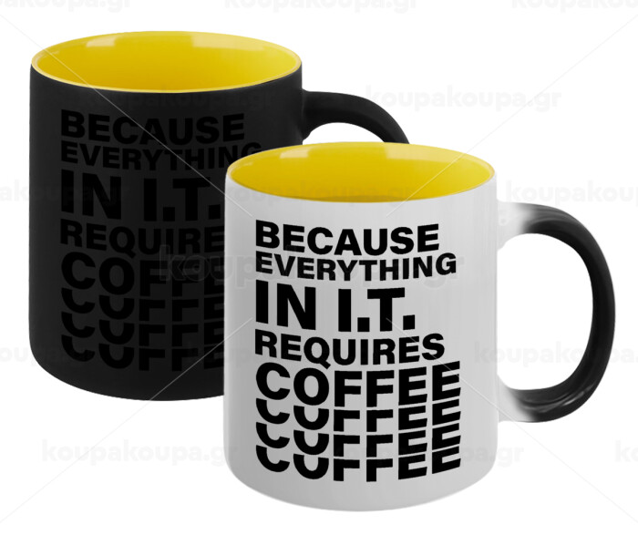 Because everything in I.T. requires coffee, Κούπα Μαγική εσωτερικό κίτρινη, κεραμική 330ml που αλλάζει χρώμα με το ζεστό ρόφημα