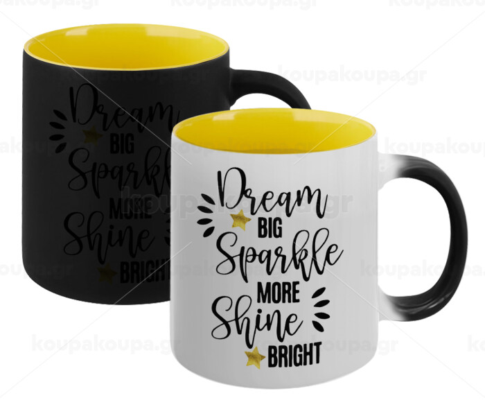Dream big, Sparkle more, Shine bright, Κούπα Μαγική εσωτερικό κίτρινη, κεραμική 330ml που αλλάζει χρώμα με το ζεστό ρόφημα