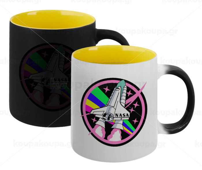 NASA pink, Κούπα Μαγική εσωτερικό κίτρινη, κεραμική 330ml που αλλάζει χρώμα με το ζεστό ρόφημα