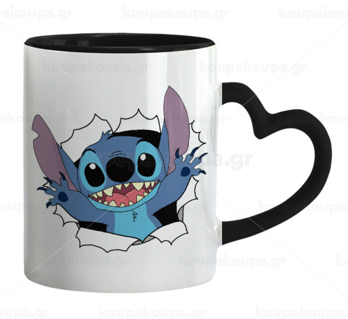 Stitch hello!!!, Mug heart black handle, ceramic, 330ml