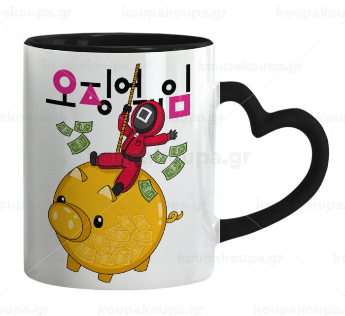 Squid game money pig, Mug heart black handle, ceramic, 330ml