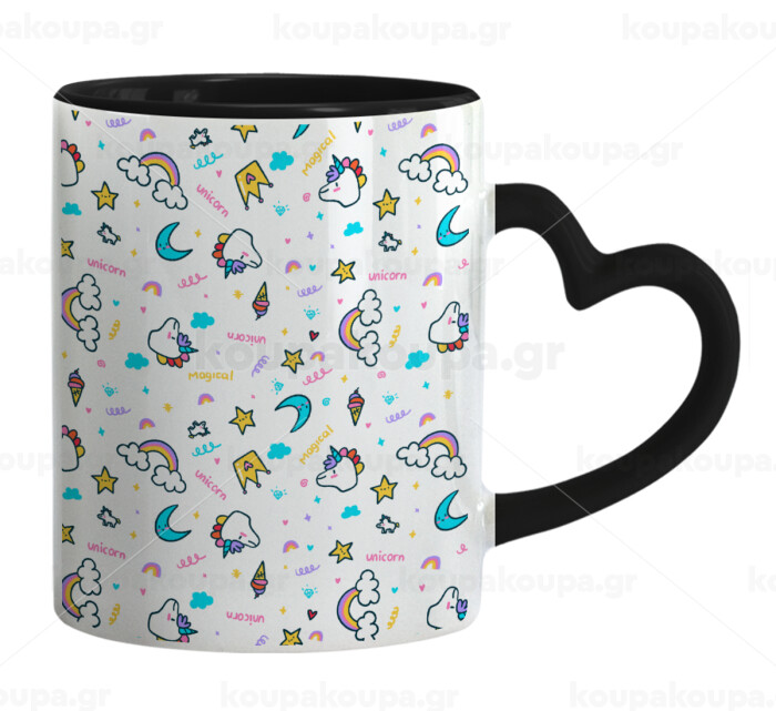 Unicorn pattern white, Mug heart black handle, ceramic, 330ml