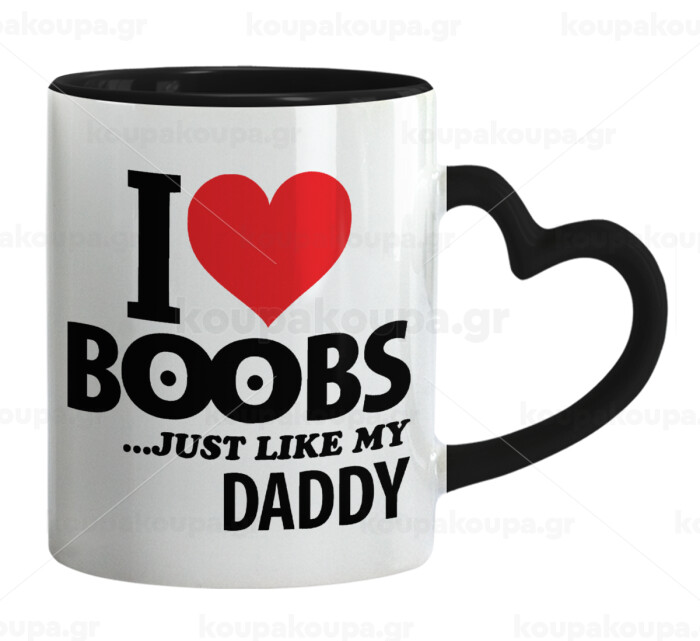 I Love boobs ...just like my daddy, Mug heart black handle, ceramic, 330ml