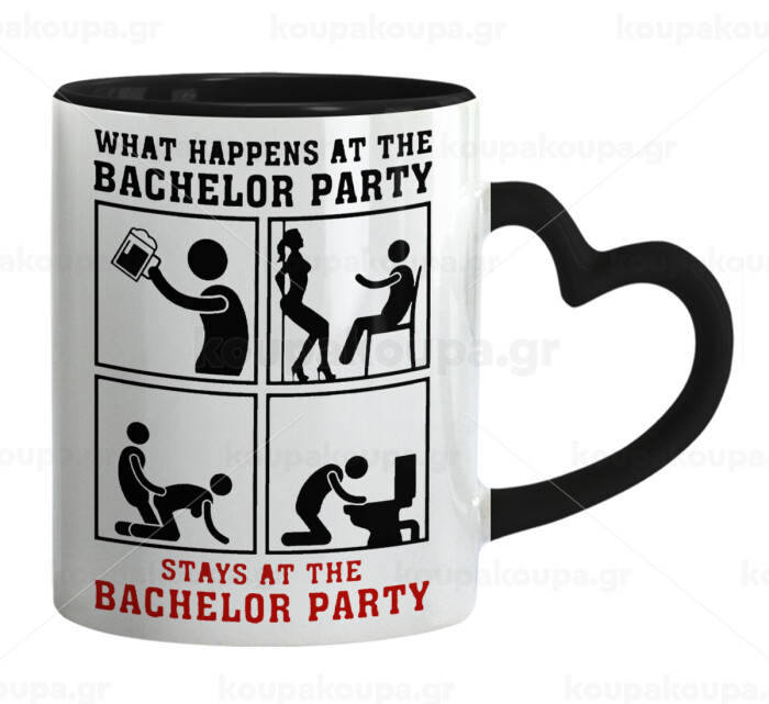 What happens at the bachelor party, stays at the bachelor party!, Mug heart black handle, ceramic, 330ml