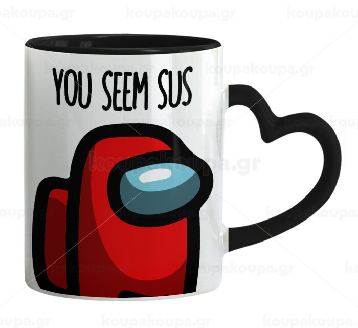 Among US, you seem sus, Mug heart black handle, ceramic, 330ml