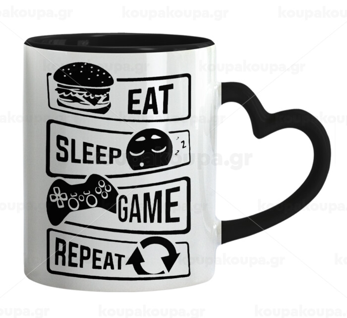 Eat Sleep Game Repeat, Mug heart black handle, ceramic, 330ml