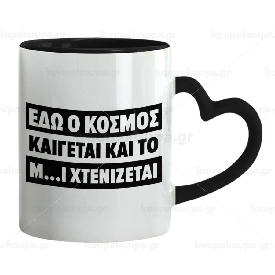Εδώ ο κόσμος καίγεται και το Μ....Ι χτενίζεται, Mug heart black handle, ceramic, 330ml