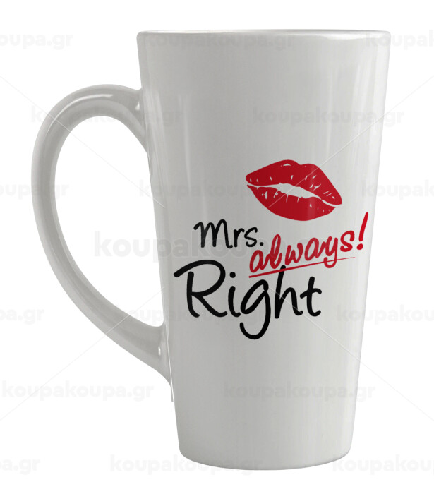 Mrs always right kiss, Κούπα κωνική Latte Μεγάλη, κεραμική, 450ml