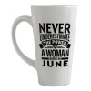 Large glossy conical latte cup of excellent quality with vibrant colors. Dishwasher safe, suitable for microwave oven. Use it for hot and cold drinks.