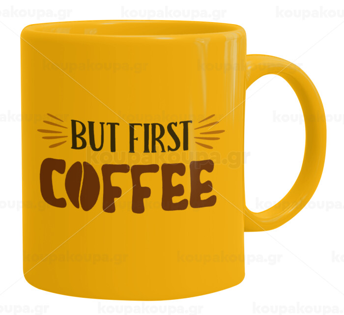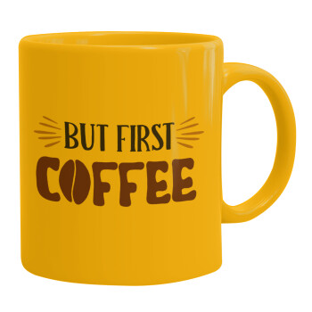 But first Coffee, Ceramic coffee mug yellow, 330ml
