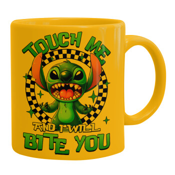Stitch Touch Me And I Will Bite You, Ceramic coffee mug yellow, 330ml