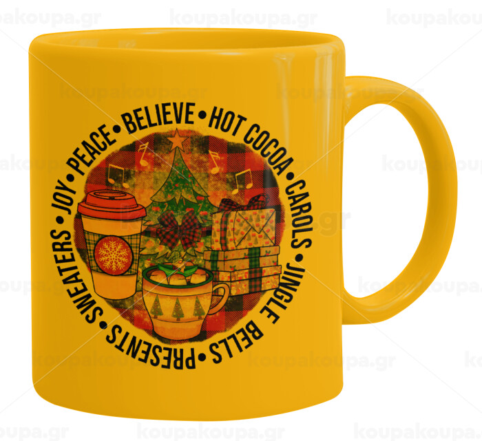 Joy, Peace, Believe, Hot Cocoa, Carols, Ceramic coffee mug yellow, 330ml