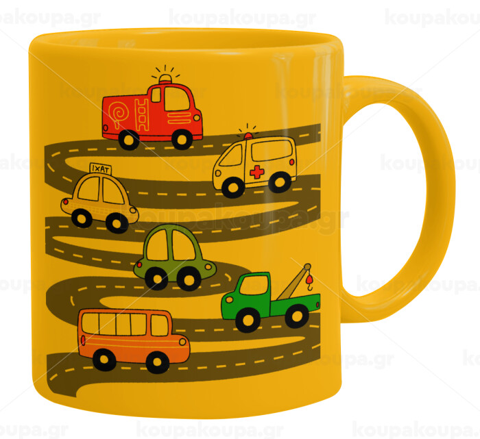 Hand drawn childish set with cars, Ceramic coffee mug yellow, 330ml