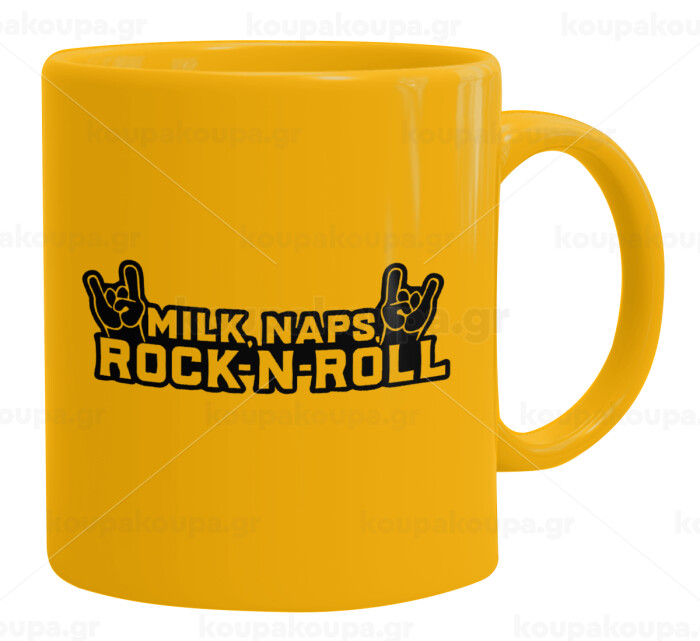 Milk, Naps, Rock N Roll, Ceramic coffee mug yellow, 330ml