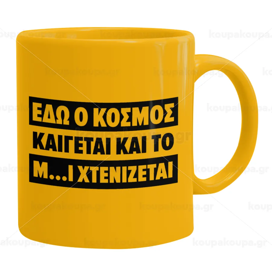 Εδώ ο κόσμος καίγεται και το Μ....Ι χτενίζεται, Ceramic coffee mug yellow, 330ml