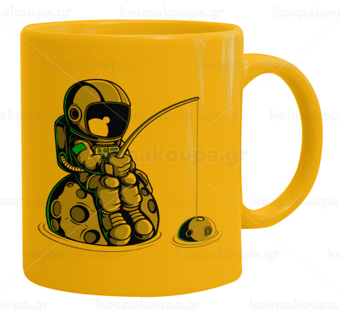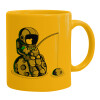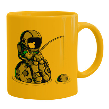 Little astronaut fishing, Ceramic coffee mug yellow, 330ml