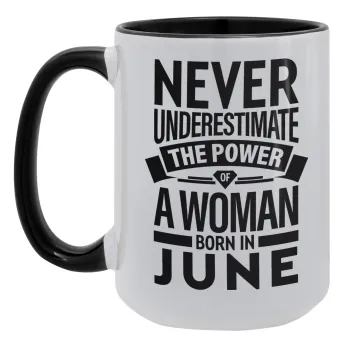Never Underestimate the poer of a Woman born in..., Κούπα Mega 15oz, κεραμική Μαύρη, 450ml