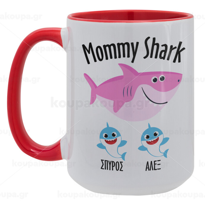 Mommy Shark (με ονόματα παιδικά), Κούπα Mega 15oz, κεραμική Κόκκινη, 450ml