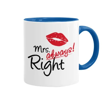 Mrs always right kiss, Mug colored blue, ceramic, 330ml