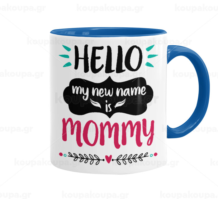 Hello, my new name is Mommy, Mug colored blue, ceramic, 330ml