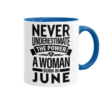 Never Underestimate the poer of a Woman born in..., Mug colored blue, ceramic, 330ml