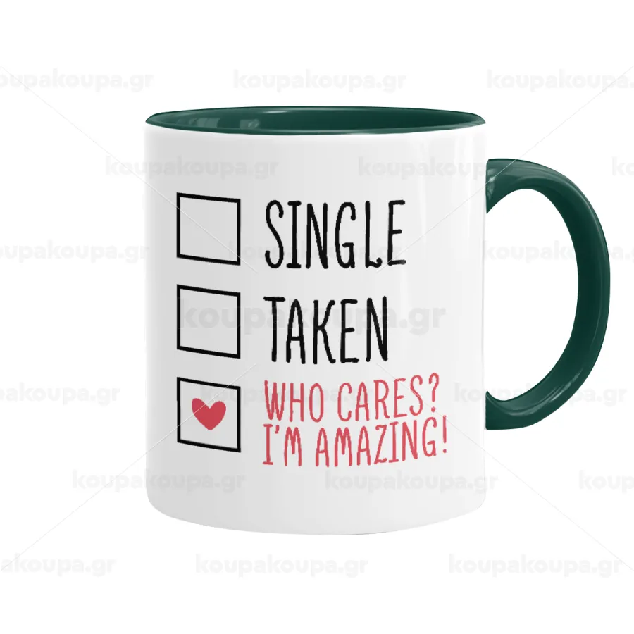 Single, Taken, Who cares i'm amazing, Mug colored green, ceramic, 330ml