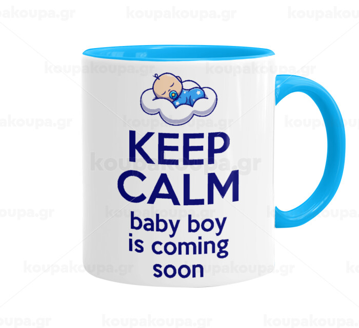 KEEP CALM baby boy is coming soon!!!, Mug colored light blue, ceramic, 330ml