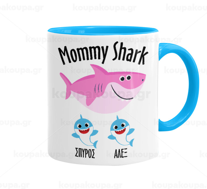 Mommy Shark (με ονόματα παιδικά), Mug colored light blue, ceramic, 330ml