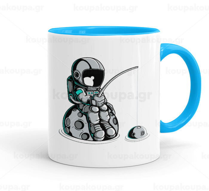 Little astronaut fishing, Mug colored light blue, ceramic, 330ml
