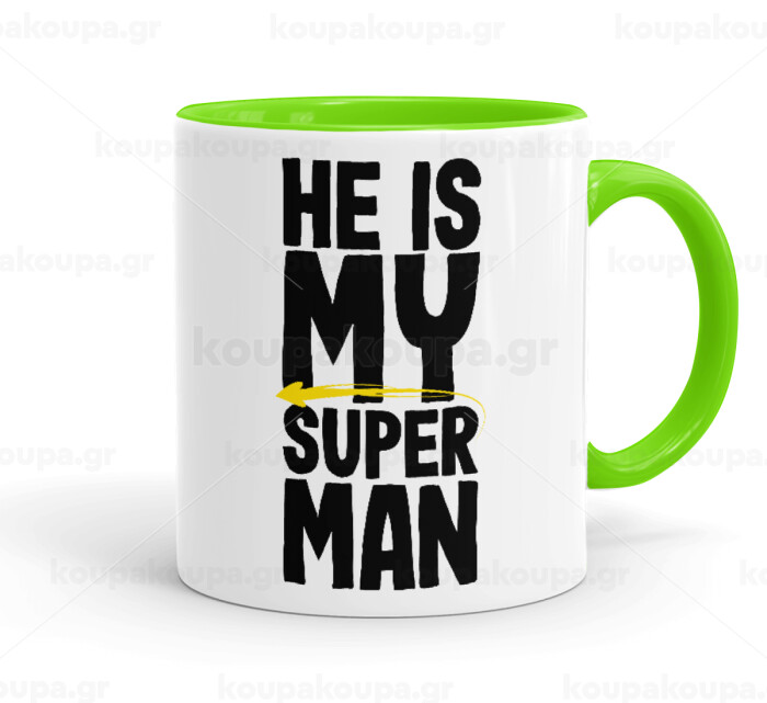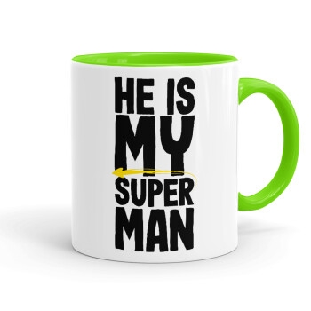 He is my superman, Mug colored light green, ceramic, 330ml
