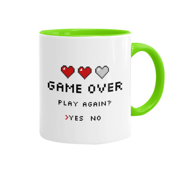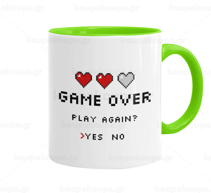GAME OVER, Play again? YES - NO, Mug colored light green, ceramic, 330ml